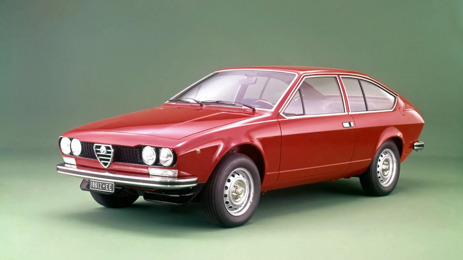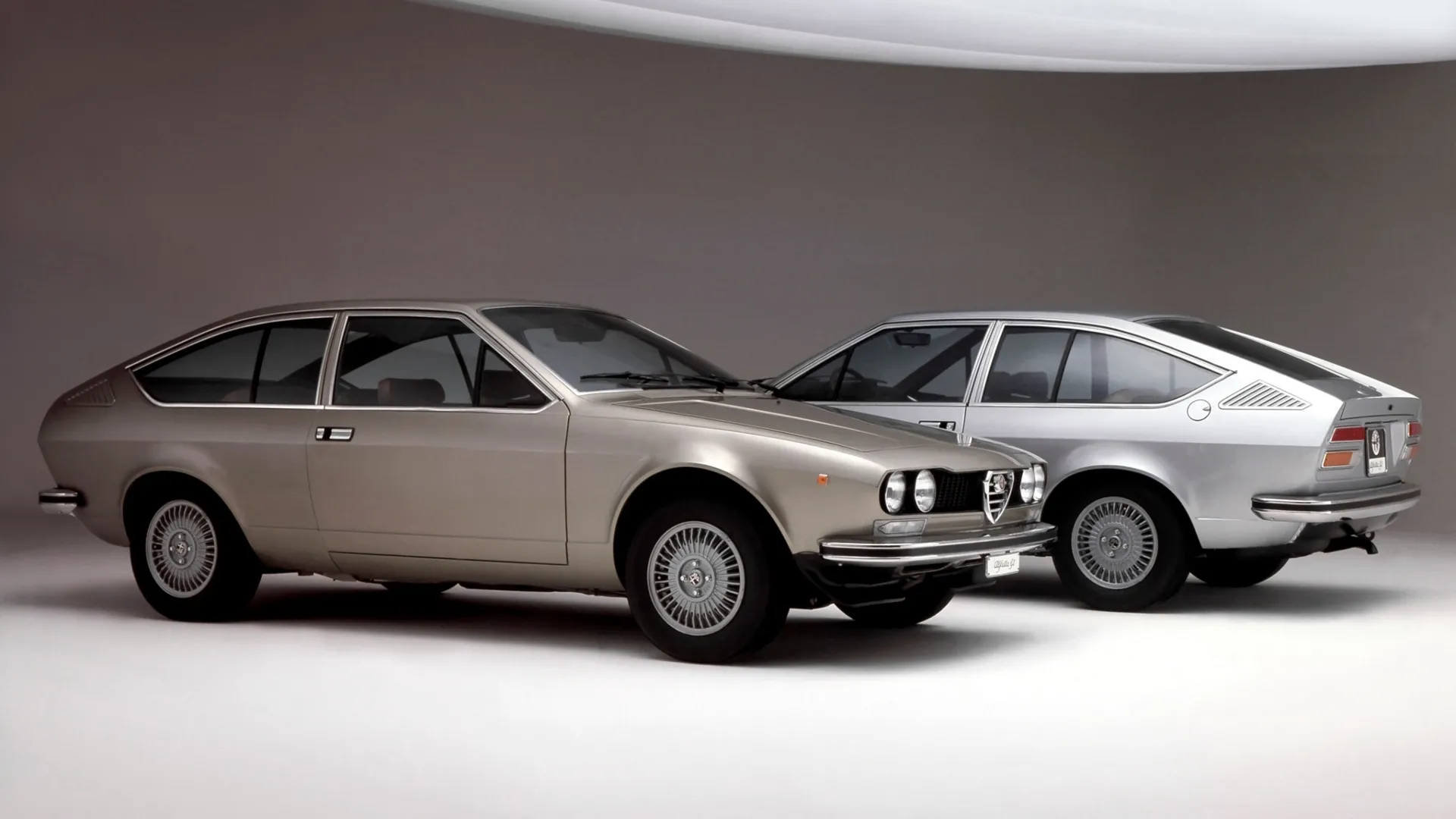 La carrozzeria sfuggente con ampi finestrini è opera di Giorgetto Giugiaro. La meccanica, con la frizione e il cambio in blocco col differenziale al retrotreno e, sotto il cofano anteriore, i quattro cilindri con distribuzione bialbero a camme in testa che hanno fatto la fortuna della casa sin dagli anni ’50, è quella, grintosa e ben bilanciata, dell’Alfetta berlina del 1972. Una linea d’autore e doti di guida da vera sportiva distinguono l’Alfa Romeo Alfetta GT, che nel 1974 raccoglie il testimone della Giulia GT ed esce di produzione dodici anni dopo. Prodotta in tre serie (dal 1980 anche con il celebre V6 Busso, la GTV6) e oltre 142.000 esemplari, l’Alfa Romeo Alfetta GT è stata l’ultima coupé a quattro posti con la trazione posteriore della casa e per questo occupa un posto speciale nel cuore degli appassionati del marchio.