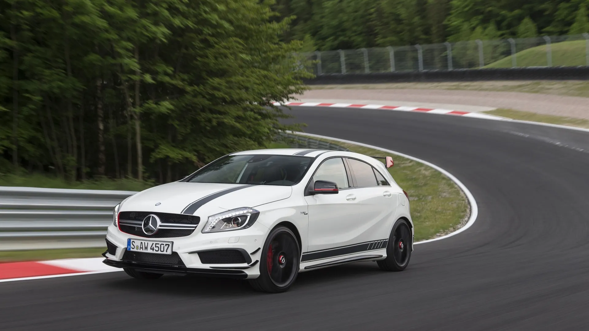 Nel 2012, con la generazione siglata W176, la Mercedes Classe A, che fino a quel momento era stata un’utilitaria-monovolume, debutta nel settore delle berline compatte e lancia il suo guanto di sfida anche nella nicchia di quelle ad alte prestazioni. Con la Mercedes-AMG A45, prima “hot hatch” con la griffe del reparto sportivo della casa, a Stoccarda puntano a mettere i bastoni tra le ruote di una veterana della categoria, l’Audi RS3. Sotto il cofano pulsa un quattro cilindri turbo a benzina da record: con 360 CV (381 dal 2015), è il 2.0 di serie più potente al mondo. La trazione è integrale, il cambio un automatico a doppia frizione con sette marce. Le prestazioni sono da sportiva vera, e per chi desidera un sound ancora più coinvolgente, c’è lo scarico sportivo Performance. Anche dentro la Mercedes-AMG A45 mette l’accento sulla sportività: la plancia ha inserti in simil carbonio, le cinture e le cornici delle bocchette del “clima” sono rosse e la strumentazione include un cronometro per prendere i tempi sul giro nei track-day.