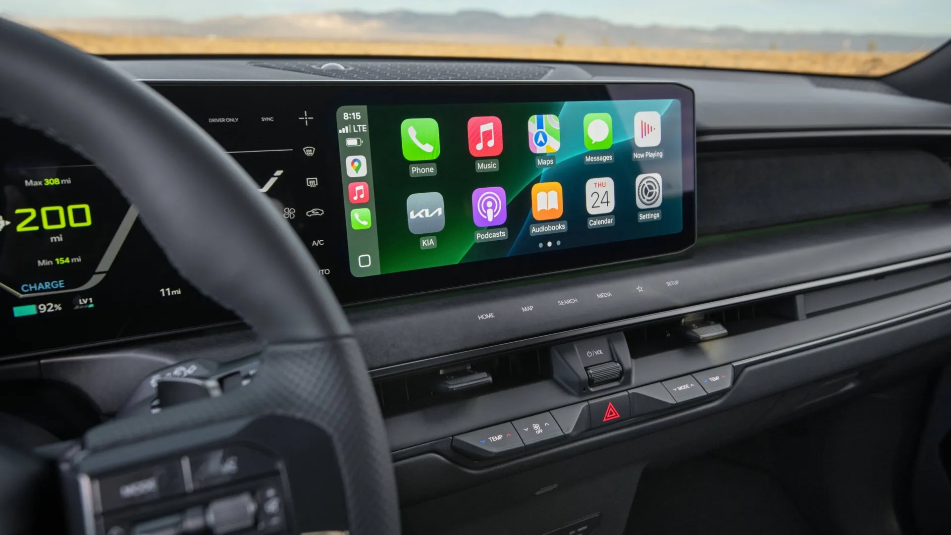 SI CHIAMA VERDE NEON, NON VERDE ACIDO! La Kia EV9 GT però fa notizia per alcuni “effetti speciali” che propone, accomunati dal colore verde acido (nome ufficiale: verde Neon) dei dettagli che identificano questa versione: le pinze dei freni, il tasto GT sul volante, le schermate specifiche del quadro strumenti in modalità GT e il punto zero sulla corona del volante. C’è poi una differenza che non si vede ma che va provata: la EV9 GT adotta infatti le sospensioni a controllo elettronico, che offrono un comfort di guida eccellente e contribuiscono a elevare le doti di stabilità grazie al controllo ottimizzato dei movimenti della scocca. Volendo sintetizzare al massimo, la EV9 GT è il classico “macchinone” per la famiglia, un’ammiraglia “mimetica” perché, dimensioni a parte, non dà nell’occhio ma che è capace di trasformarsi, appena le circostanze lo permettono oppure appena si ha voglia di chiederle il massimo delle performance, attivando la modalità di guida GT con l’apposito tasto, premendo il quale si mettono in ombra i drive modes connessi ai menu Drive e Terrain posti nella zona inferiore del volante, quelli che in genere si utilizzano per ridurre l’assorbimento di energia e aumentare l’autonomia (Eco) o per affrontare terreni molto scivolosi (Snow).