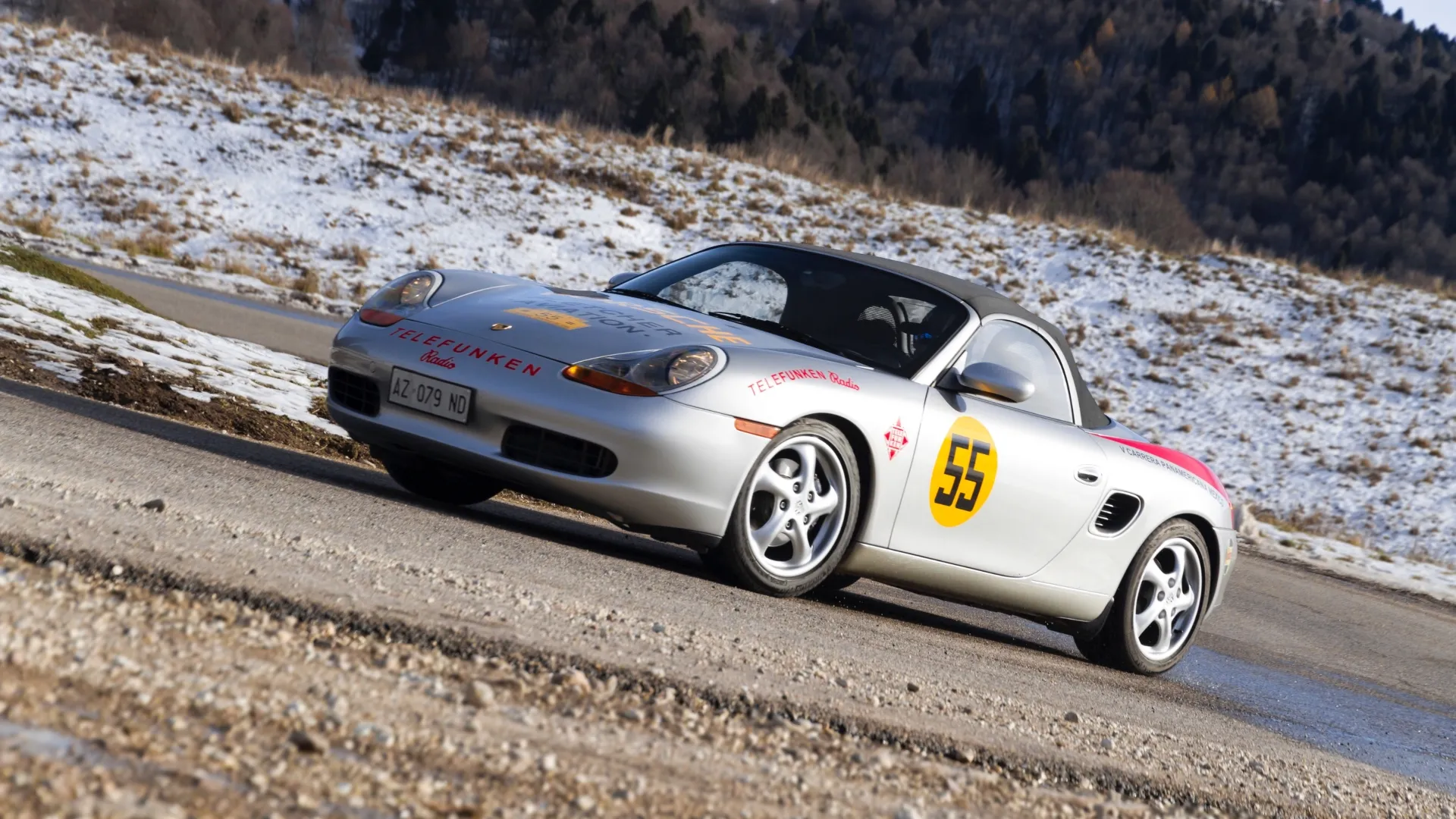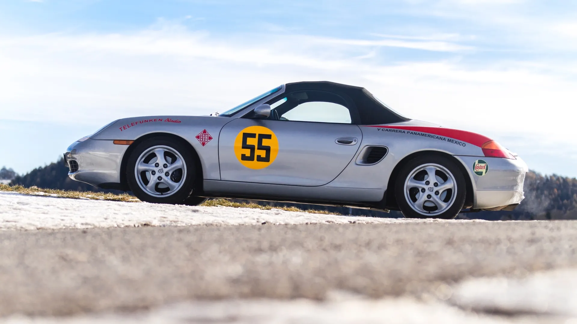 LA PRIMA BOXSTER: SOBRIA, AUTENTICA. La 986 2.5 non può contare su un tale effetto ‘wow’, monta il sei cilindri boxer ‘entry level’ da 204 cavalli e ha una sobria combinazione di carrozzeria argento e interni in pelle nera però non ha nemmeno 44.000 chilometri alle spalle ed è in condizioni da viaggio nel tempo; benvenuti nel 1996. Il chilometraggio irrisorio non è l’unica freccia nella faretra di questa Mk1, di fabbrica ha il pacchetto ‘Sport’ con cerchi da 17’’, barre antirollio più rigide e molle più basse di 10 millimetri, in più – sfido a non notarlo – le morbide curve della Boxster sono ravvivate dalla livrea ‘Telefunken’ sfoggiata dalla Porsche 550 Spyder durante la Carrera Panamericana del 1952 e vinta proprio dalla sfogliatina tedesca.