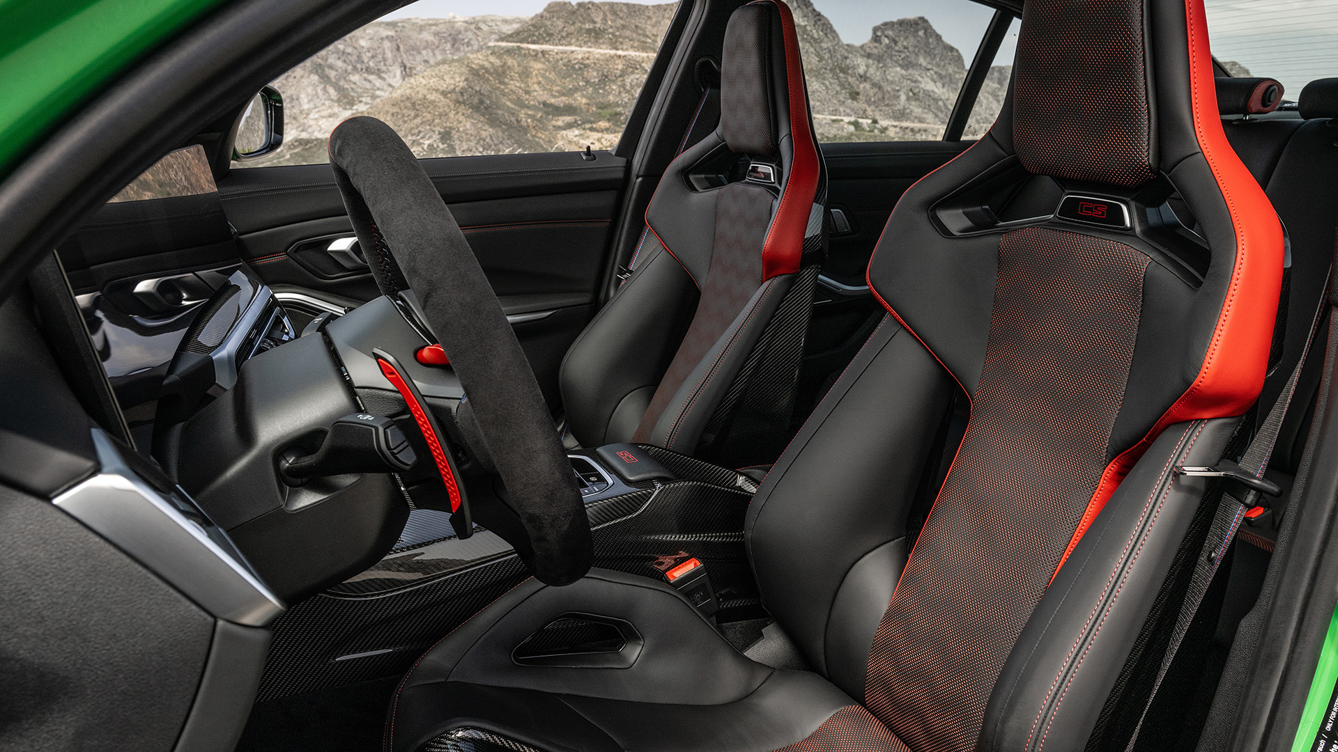 BMW M3 CSESTREMA MA DIGITALIZZATA. Anche l’abitacolo, ovviamente, presenta un’impostazione e uno stile assolutamente da “racing addicted”, anche qui sono in carbonio le palette del cambio dietro il volante, alcune parti della plancia e del tunnel centrale e i sedili sportivi. Questi ultimi sono rivestiti in pelle Merino con inserti rossi e cuciture a contrasto, mentre i pannelli delle porte sono in pelle nera. L’abitacolo è anche fortemente digitalizzato e, come nel caso di tutte le ultime BMW, offre il Curved Display, che ingloba lo schermo della strumentazione da 12,9 pollici e quello da 14,9 pollici del sistema di infotainment. Il software è l’ iDrive 8. Il BMW Live Cockpit Professional, include di serie il sistema di navigazione BMW Maps, il BMW Intelligent Personal Assistant, l’integrazione e il caricabatteria wireless per gli smartphone e un’interfaccia WiFi. A richiesta c’è il BMW Head-Up Display con grafiche specifiche M e il BMW Drive Recorder.
