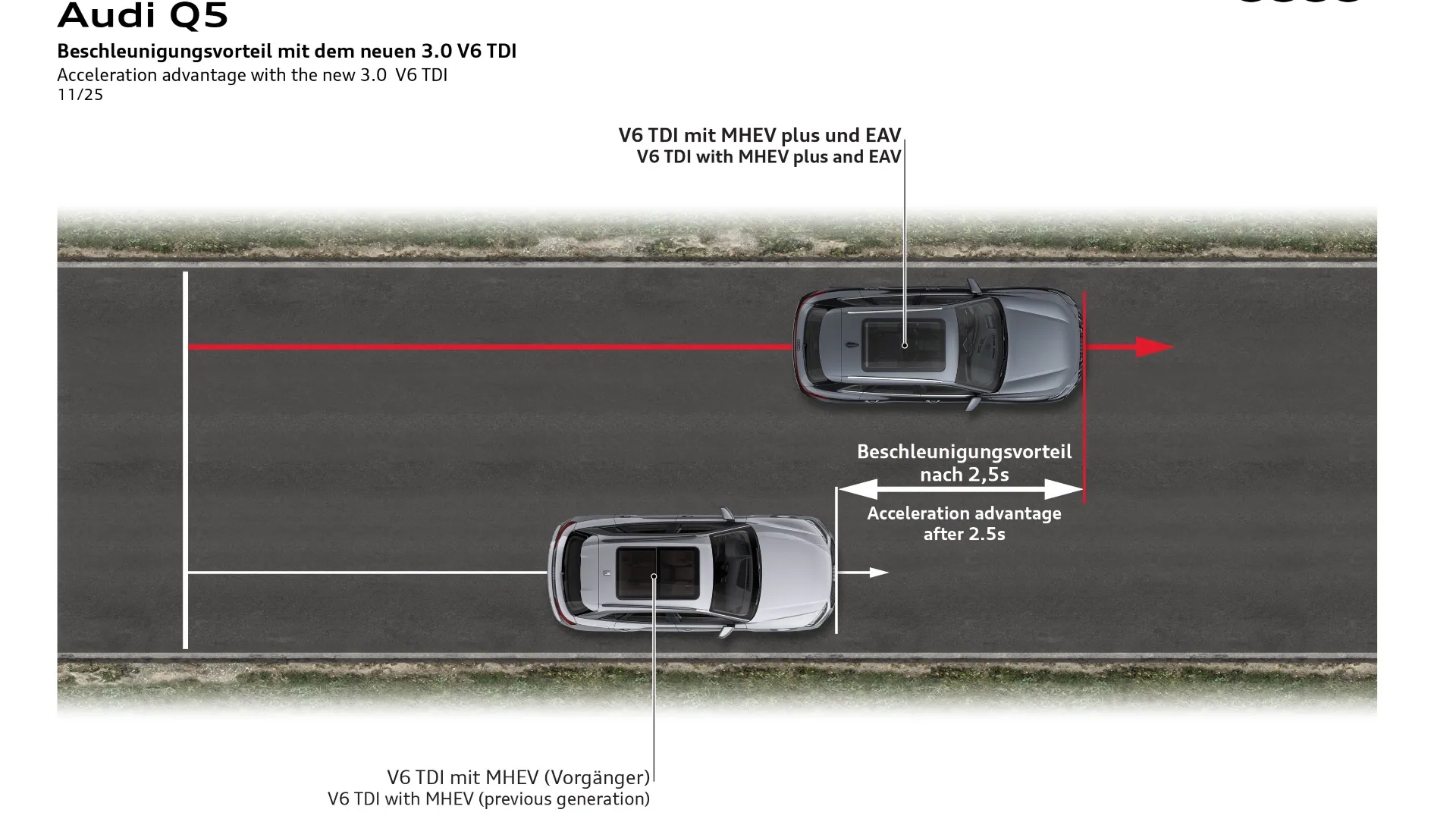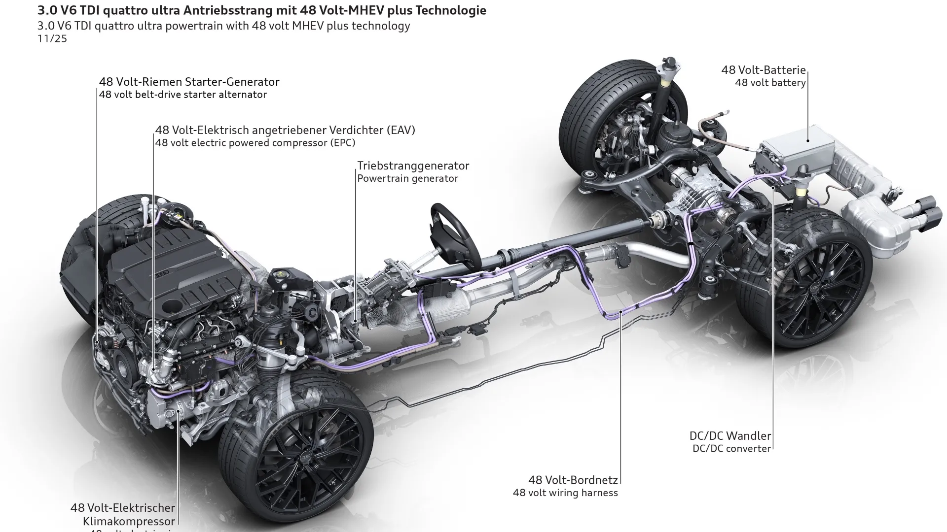 COME FUNZIONA. Come anticipato, è la prima volta in cui la tecnologia a 48 volt viene abbinata alla doppia sovralimentazione con turbocompressore e compressore elettrico (EAV). L’Audi sostiene che la collaborazione tra powertrain generator, EAV e turbo permette al nuovo V6 3.0 TDI EA897evo4 di rispondere quasi istantaneamente all’acceleratore, garantendo riprese più pronte e un’erogazione di coppia immediata sin dai regimi più bassi, con vantaggi sia in termini di prestazioni sia di efficienza. In fase di avvio l’auto viene mossa elettricamente dal PTG, poco dopo interviene il compressore elettrico, che fornisce sovralimentazione senza inerzia e assicura coppia immediata grazie all’alimentazione a 48 volt. Solo in un secondo momento entra in funzione il turbocompressore tradizionale, quando i gas di scarico raggiungono la pressione necessaria. Il compressore elettrico, posizionato dopo turbocompressore e intercooler, interviene quando si richiede forte carico e i gas di scarico non hanno ancora energia sufficiente. In questi frangenti comprime ulteriormente l’aria già precompressa dal turbo, migliorando la prontezza del motore.