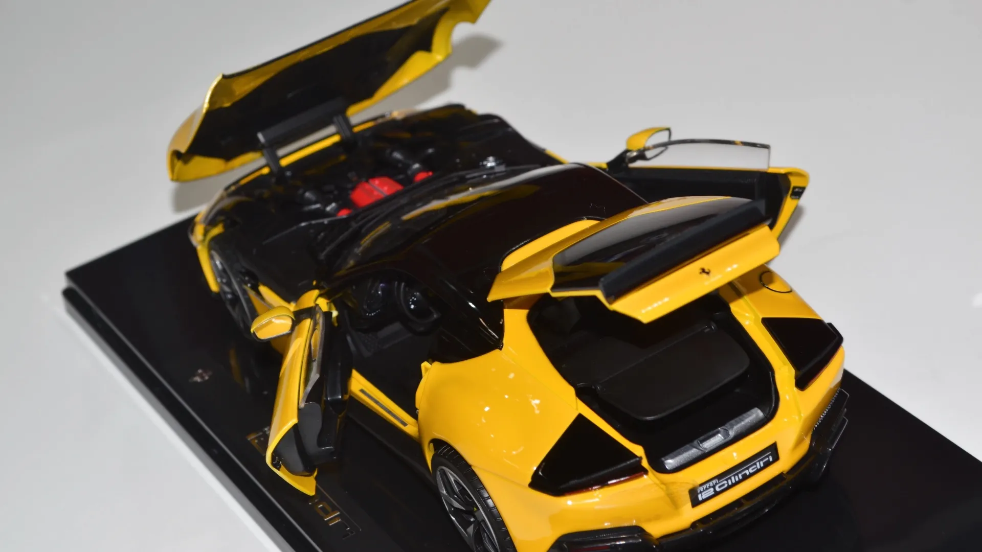 ALTRE NOVITà ANCHE IN 1/64 Più AVANTI. In arrivo invece nell’ultimo trimestre del 2026 la 296 Speciale (in giallo Montecarlo metallizzato, Rosso Magma e Rosso Corsa) e la 849 Testarossa (in Rosso Corsa e Rosso Magma). Due le linee di prodotto, differenti in pochi dettagli: la serie “base” con vetrinetta costa 89,95 euro, quella in serie limitata e numerata singolarmente, costa 119,95 euro. Ma il 2026 della Polistil non si ferma qui: seguendo il trend che vuole in forte crescita la scala 1/64 (quella delle HotWheels, a grandi linee), la Casa italiana scenderà presto in campo con le rosse 499 P ufficiali vincitrici alla 24 Ore di Le Mans del 2023 e 2024 e con la gialla di AF Corse schierata nel 2024, oltre che con la SF24 di Leclerc. A loro si aggiungeranno nel secondo trimestre le SF25 di Leclerc e Hamilton, già annunciate, ma non ci sorprenderemmo se trovassimo presto in vendita la 499 P vincitrice della 24 Ore di Le Mans del 2025. Anche in questo caso il packaging fa la sua parte: le miniature in 1/64 hanno una bella vetrinetta e sono fissate a una elegante e sobria basetta nera. Un debutto promettente, a quale abbiamo avuto occasione di assistere.