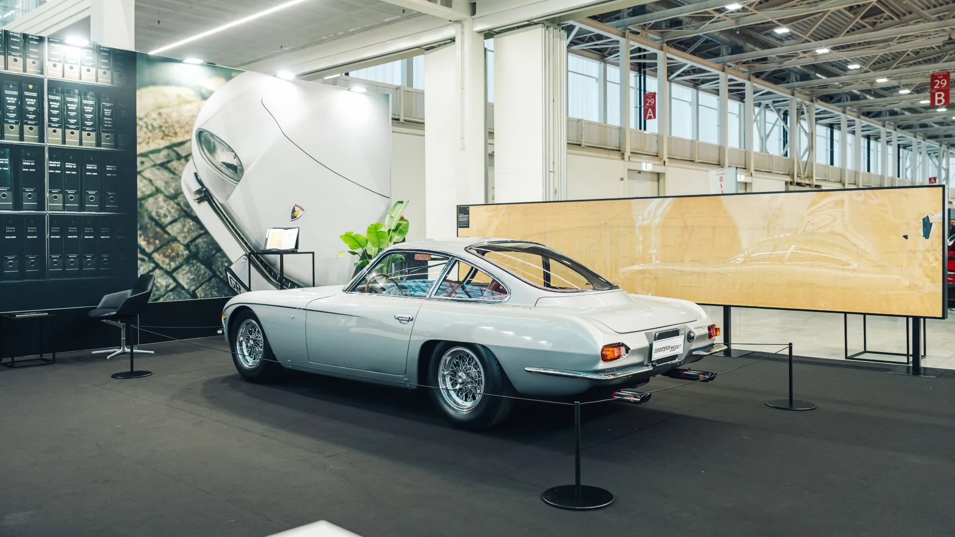 L’INIZIO DELLA LEGGENDA. Quest’anno la vedette dello stand del Lamborghini Polo Storico è una 350 GT, ossia la granturismo che nel 1964 diede inizio alla leggenda delle supercar di Sant’Agata Bolognese. Ma quella color argento non è una 350 GT qualsiasi, bensì la seconda prodotta, nonché la più antica esistente al mondo. E su una parete, protetto da una teca di vetro, come un’opera d’arte, campeggia, ingiallito e sbrecciato dal tempo, il disegno in scala 1:1 dello studio d’abitabilità della vettura.