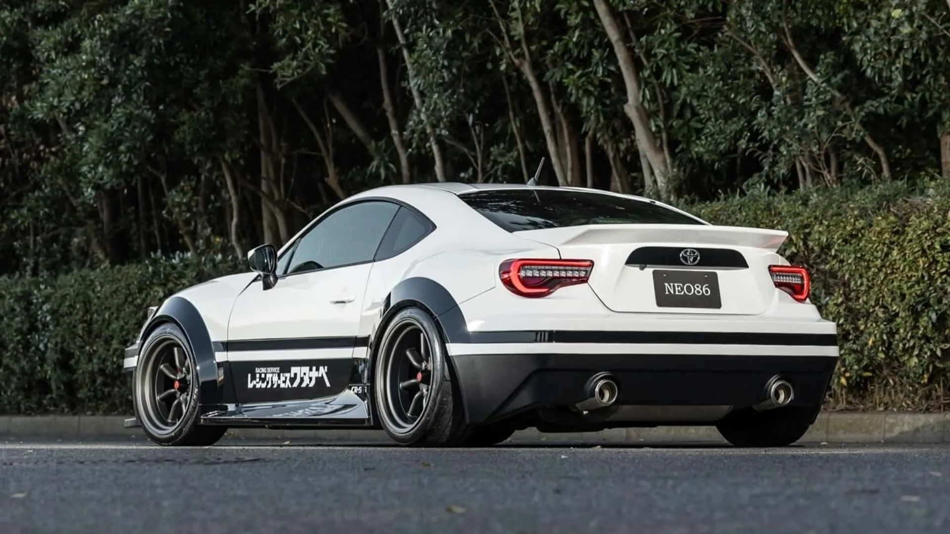 Per far sì che le morbide linee della GT86 assomigliassero a quelle di… sua nonna (non è un caso, quel numero 86 dopo la sigla GT), il tuner ha dovuto tribolare un po’, disegnando paraurti anteriori e posteriori più netti e rettangolari, e integrando nel muso i mitici fari a scomparsa della Trueno AE86. Non potevano mancare, poi, cerchi in stile Minilite e un piccolo alettone a coda d’anatra quasi orizzontale, oltre alla livrea sfoggiata dalla Toyota di Takumi Fujiwara (protagonista del manga Initial D): passaruota e fascia inferiore neri, a contrasto con la parte superiore bianca; non abbiamo la minima idea di cosa dica la scritta in giapponese, ma sopra, in piccolo, compare Racing Service, quindi opteremo per quello anziché Fujiwara Shop.