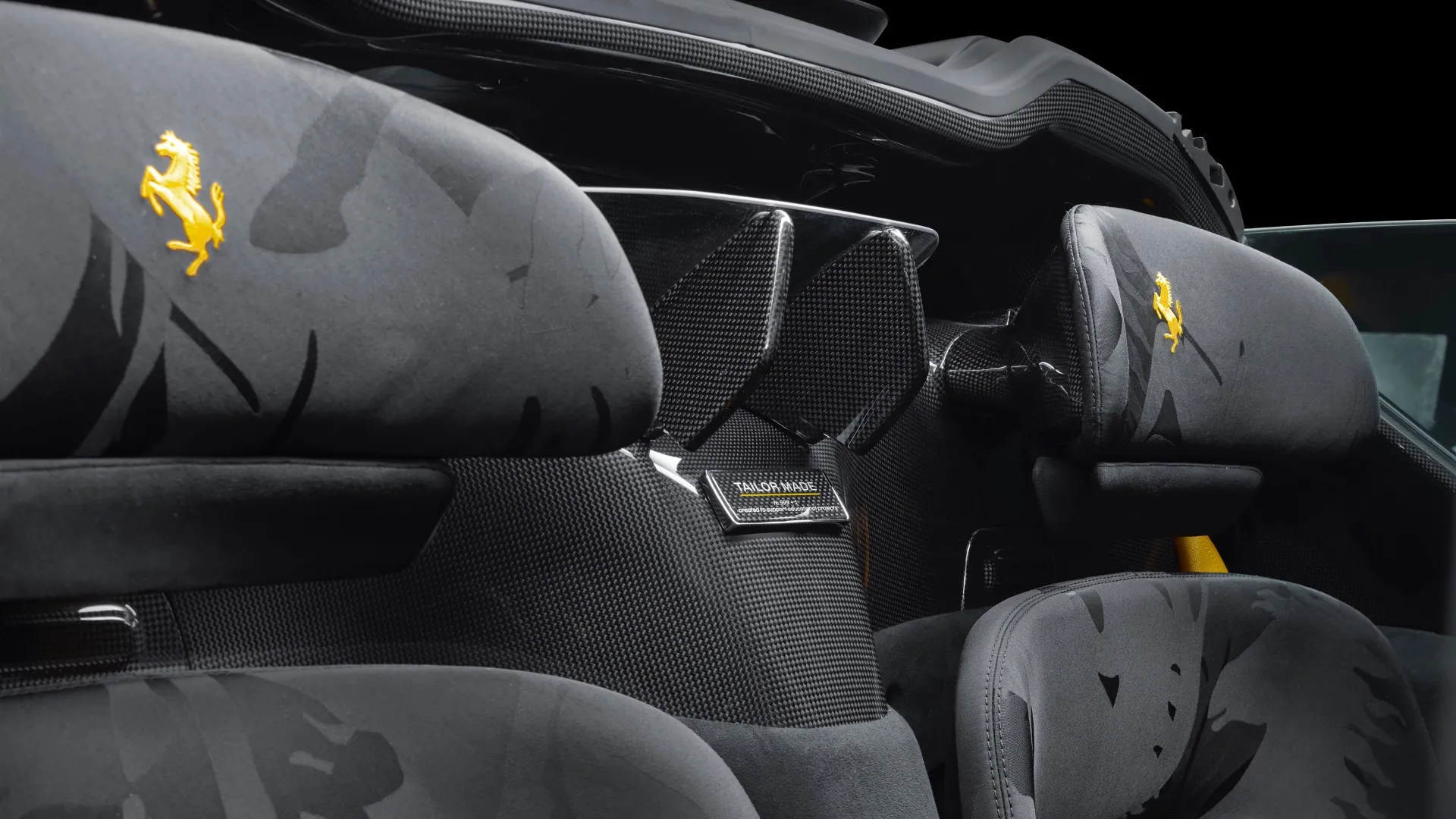 Ma questa SP3 non si distingueva solo all’esterno. Ogni dettaglio, dentro e fuori, è stato sviluppato dal programma Ferrari Tailor Made. Gli interni adottano materiali sostenibili come il tessuto Q-Cycle, ricavato da pneumatici riciclati, abbinato a cuciture gialle, cinture coordinate e Cavallino Rampante ricamato sui poggiatesta. Persino la fibra di carbonio della strumentazione e del piantone dello sterzo richiama quella utilizzata dalla Scuderia, mentre il volante in Alcantara con comandi stile F1 rafforza il legame con il mondo delle corse. Come si addice a un esemplare fuori scala, anche gli oggetti di accompagnamento sono unici: dalla Maranello Clutch in carbonio con interni in ultra-suede Giallo Modena, fino al telo coprivettura dedicato, passando per il kit di attrezzi e il mantenitore di carica. Il tutto certificato da una targhetta in argento con la dicitura “599+1”, a suggellarne lo status irripetibile.