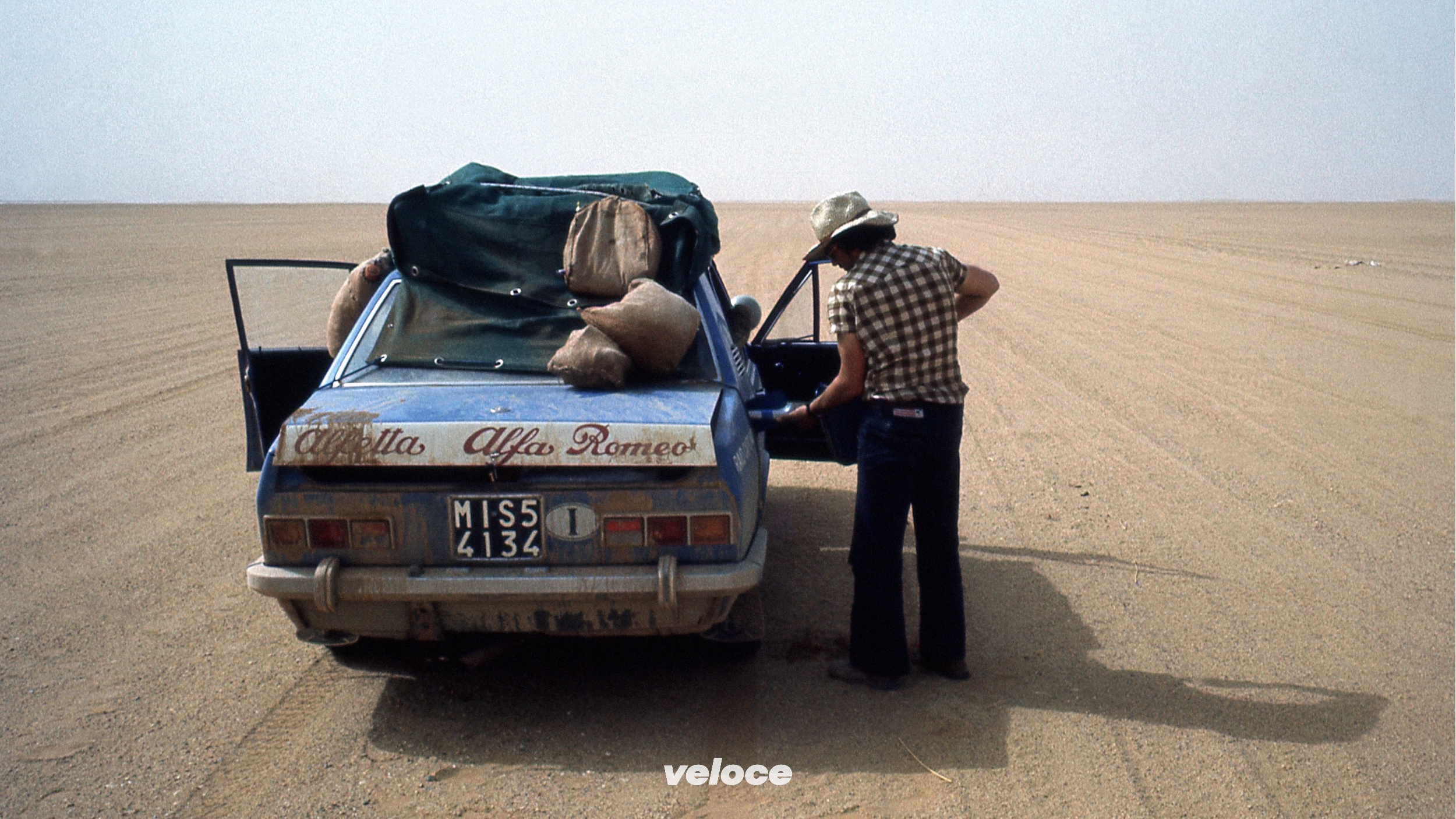 CONQUISTÒ L’EUROPA E L’AFRICA CON POCHISSIME MODIFICHE. Oggi come ieri, quel che sorprende da un punto di vista tecnico è come l’Alfetta, animale da strada privo d’ogni velleità fuoristradistica, sia riuscita a divorare piste sconfinate fatte quasi interamente di sassi e buche quasi fosse una Land Rover, col suo ruggente motore bialbero sempre su di giri, più forte di sabbia, polvere, fango e persino delle vertiginosi escursioni termiche tra un capo e l’altro della Terra. E la cosa più straordinaria è che la macchina rimase praticamente identica a com’era uscita dalla catena di montaggio. Gli uomini del reparto sperimentale del Portello si limitarono ad aggiungere un paio di piastre metalliche sotto la pancia della vettura, per proteggere la coppa dell’olio e il gruppo frizione-cambio-differenziale, il cosiddetto ‘maialino’ sospeso alla scocca al posteriore. L’allestimento era completato da un ampio paravacche frontale, da gomme tassellate e da un set di filtri antipolvere per garantire un funzionamento ottimale dei servizi ausiliari, con un filtro dell’aria supplementare lavabile a bagno d’olio per dare fiato al motore nelle situazioni di guida più impegnative.