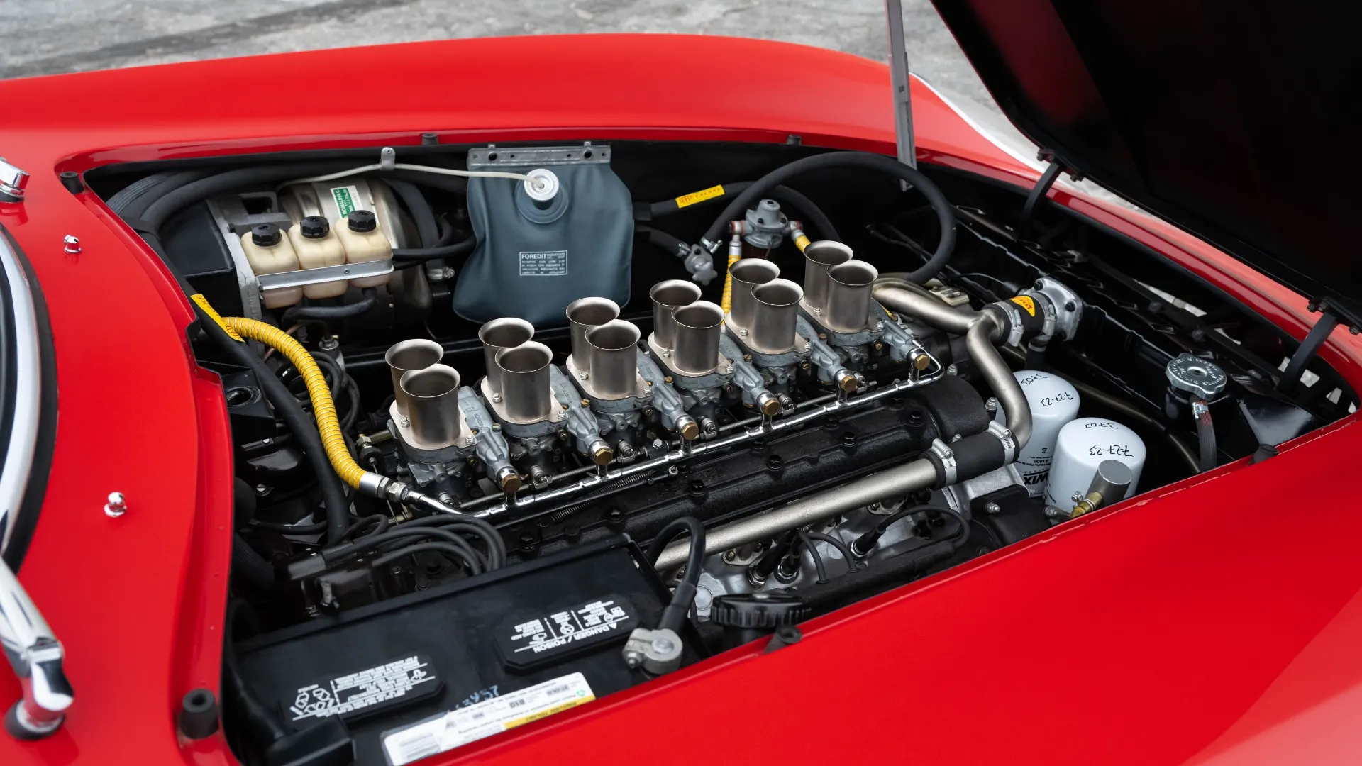 Sopra, la Ferrari 275 GTB4; sotto, il suo V12 con due alberi a camme per bancata