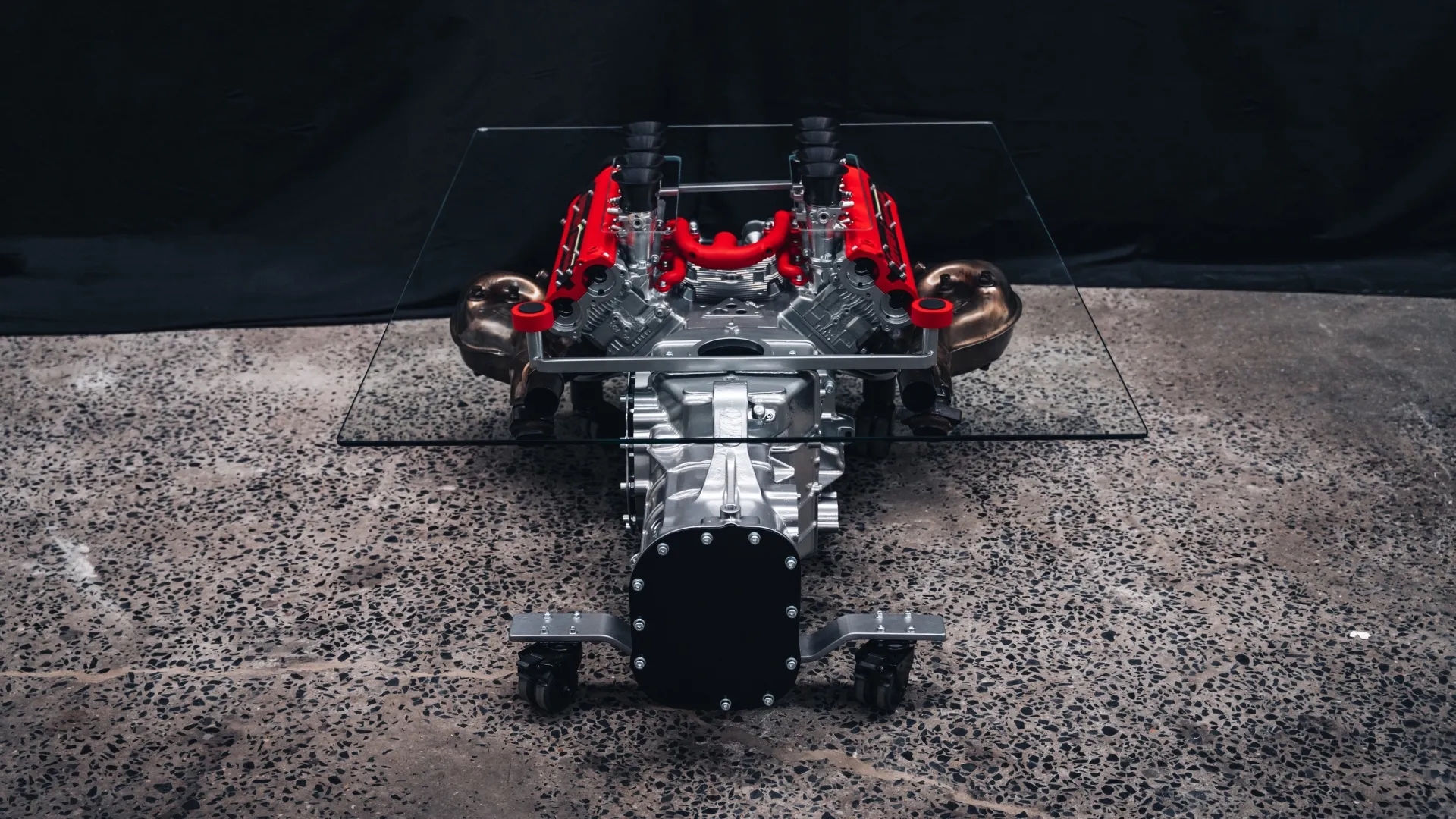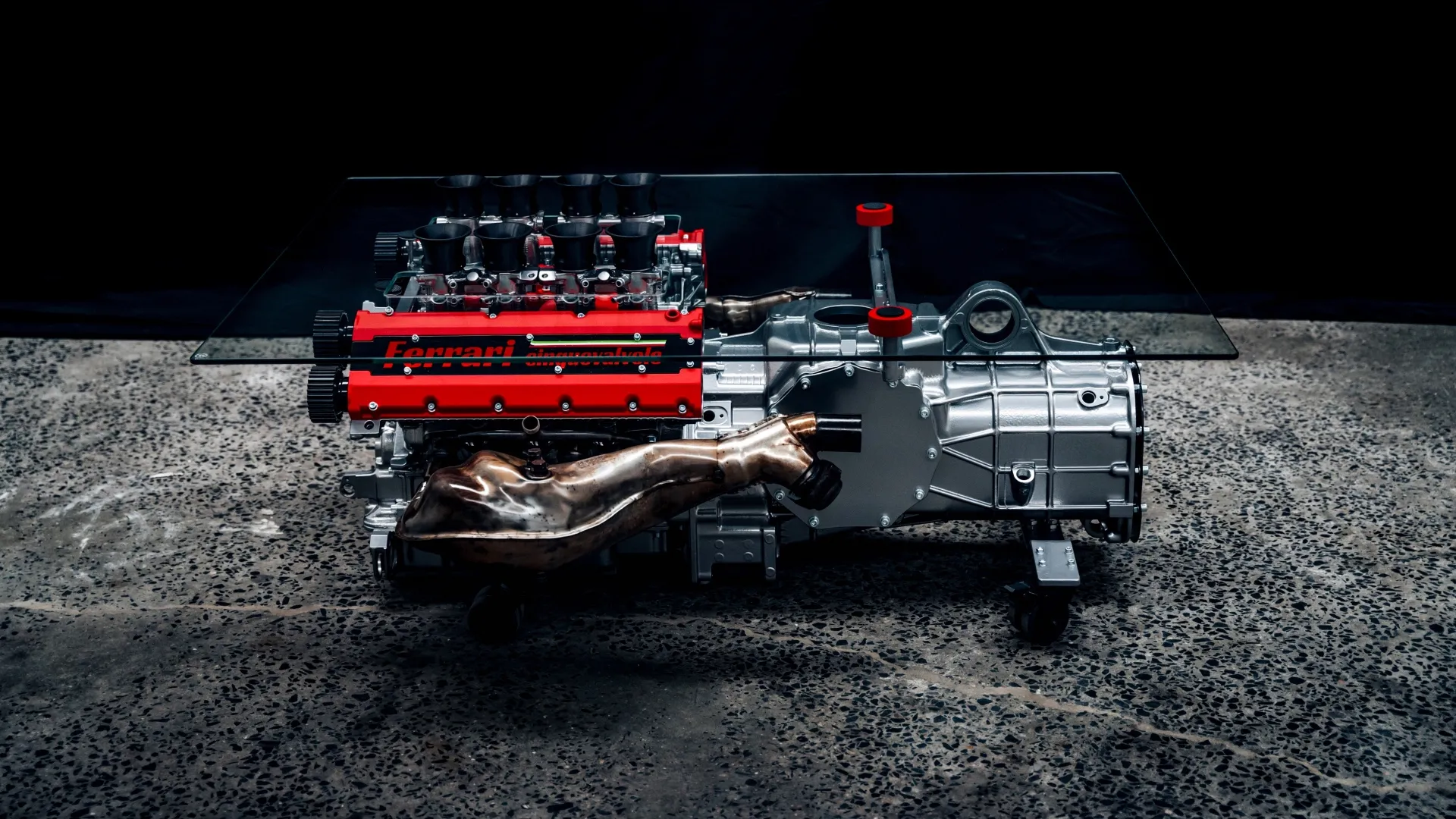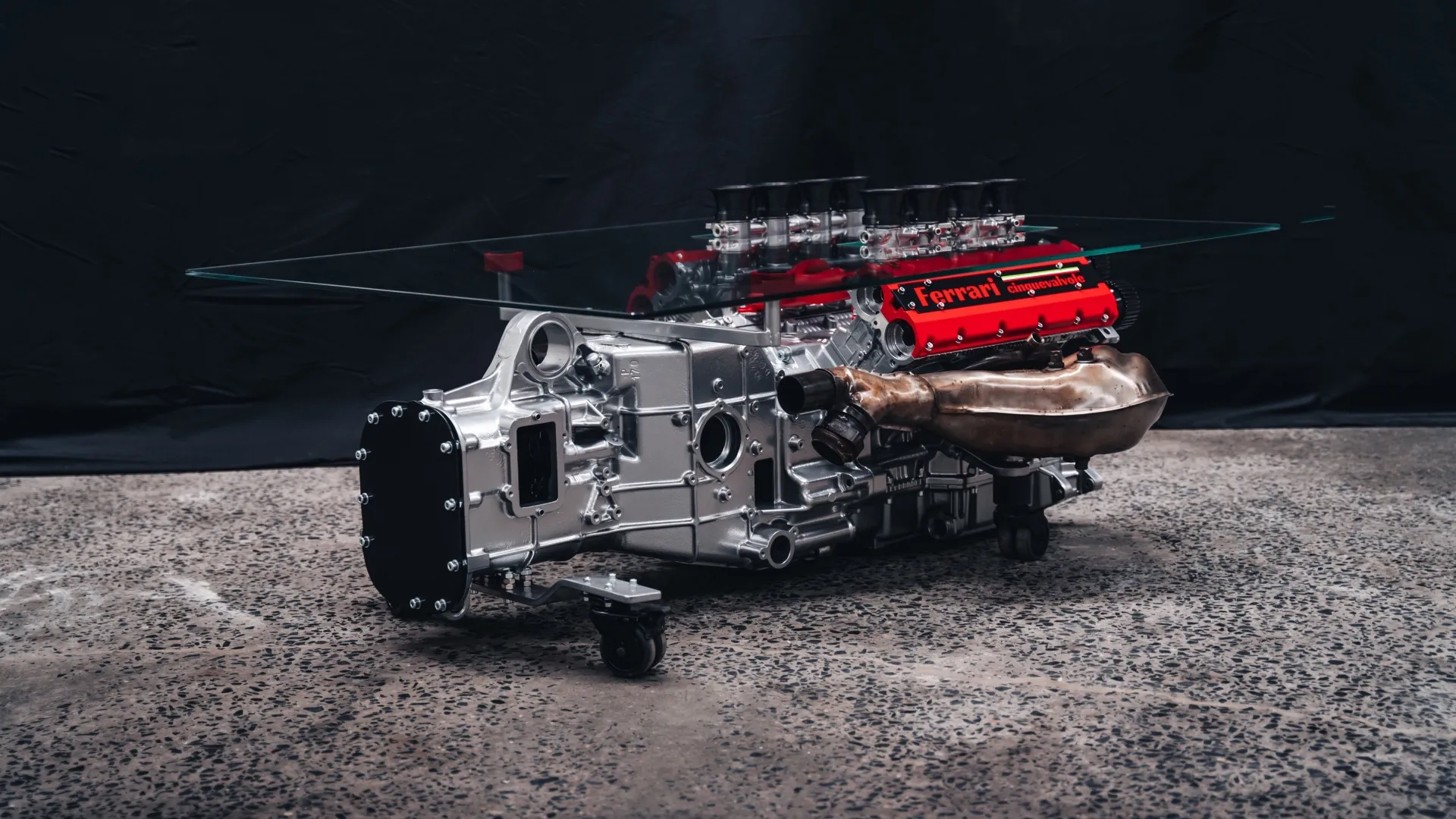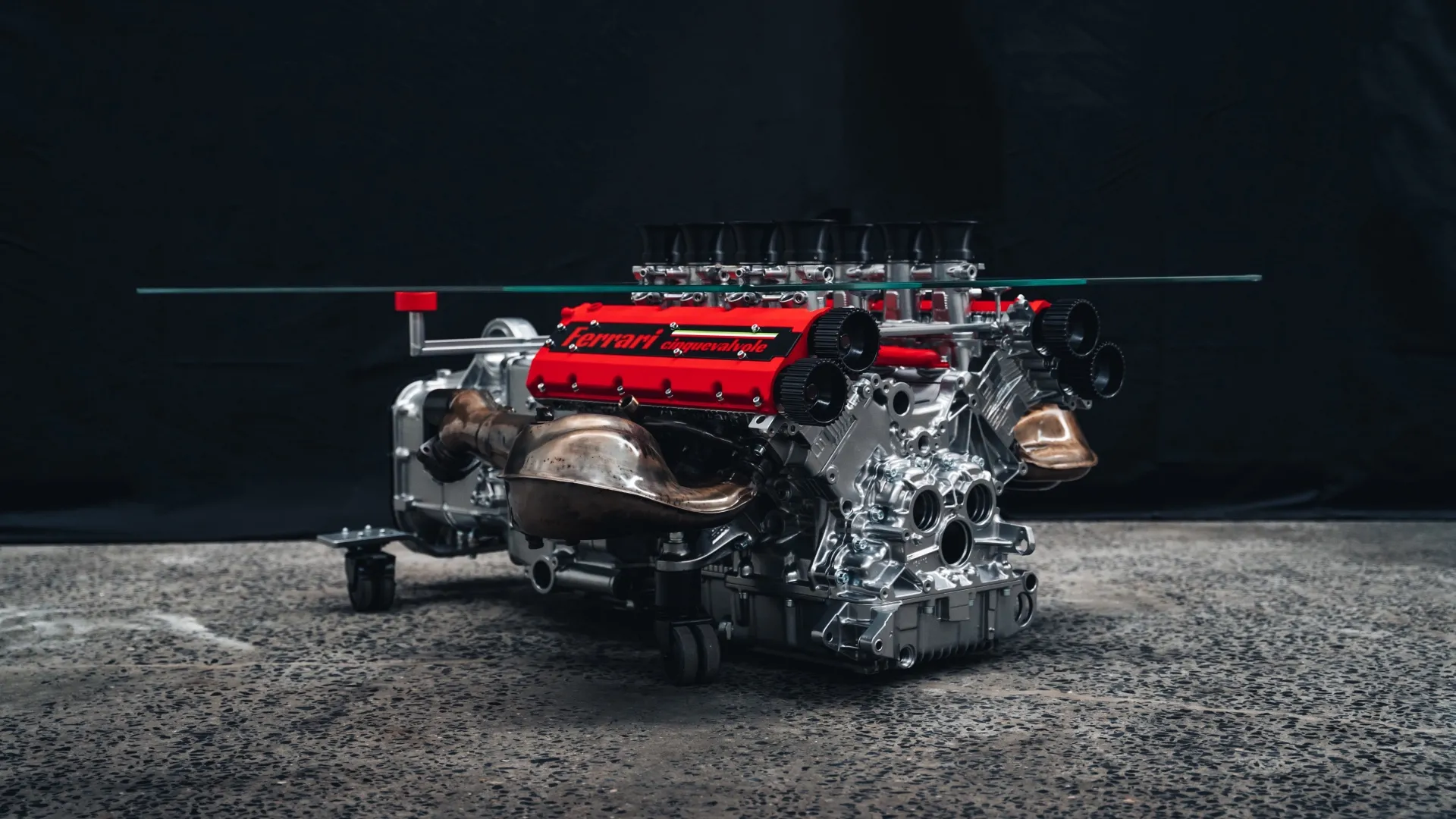 DESIGN INDUSTRIALE E SOLUZIONI SU MISURA. Il piano superiore è una lastra di cristallo temperato di 135×100 cm, scelta per la sua trasparenza che garantisce la massima visibilità al motore sottostante. Un dettaglio distintivo è la lavorazione del vetro: sono stati praticati otto fori precisi per permettere ai cornetti di aspirazione originali di emergere sulla superficie, creando una fusione fisica tra il piano d’appoggio e l’anima del motore. La praticità non è stata trascurata, nonostante il peso importante dell’insieme: la struttura poggia su quattro ruote girevoli dal design discreto, che consentono di posizionare il tavolo con facilità. Anche i collettori di scarico sono stati mantenuti nella loro posizione naturale, estendendosi ai lati e conferendo all’oggetto un profilo dinamico che vuole richiamare direttamente le linee della Berlinetta originale.