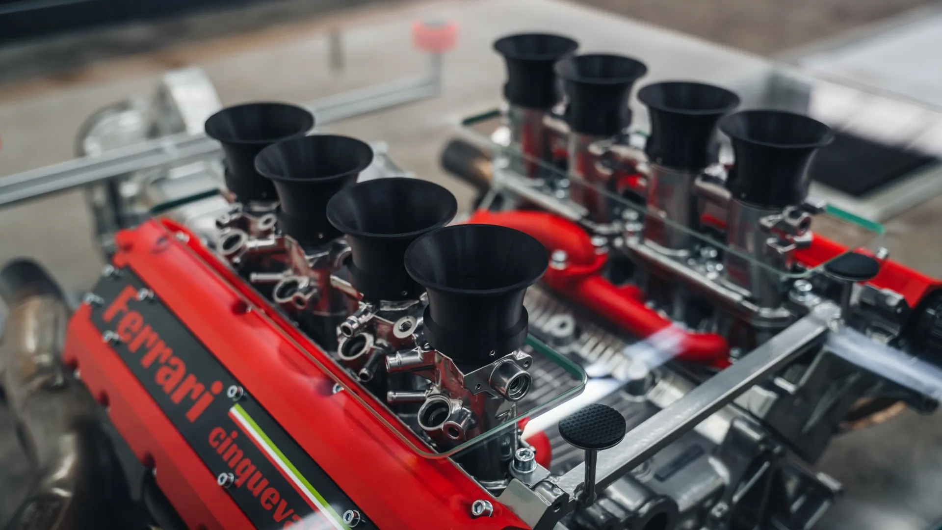 UNA MECCANICA LEGGENDARIA. Il cuore di questa installazione è il motore V8 Tipo F129B da 3,5 litri, un propulsore che ha segnato un’epoca per la Ferrari negli Anni ‘90. Celebre per essere stato il primo motore stradale della casa a utilizzare la tecnologia a cinque valvole per cilindro (tre per l’aspirazione e due per lo scarico), questo pezzo rappresenta un momento di massima espressione ingegneristica del Cavallino. Nel tavolino, il blocco motore è presentato insieme alla sua scatola del cambio transaxle, che funge da solida base strutturale per l’intera opera. La finitura del propulsore è stata curata per evidenziare i dettagli costruttivi: l’alluminio a vista contrasta con il rosso acceso delle testate, un marchio di fabbrica inconfondibile. Ogni componente, dai condotti ai cablaggi, è stato ripulito e preservato, permettendo di osservare da vicino la complessità di un’unità capace, in origine, di girare fino a 8.250 giri e che sulla F355 erogava 375 CV.
