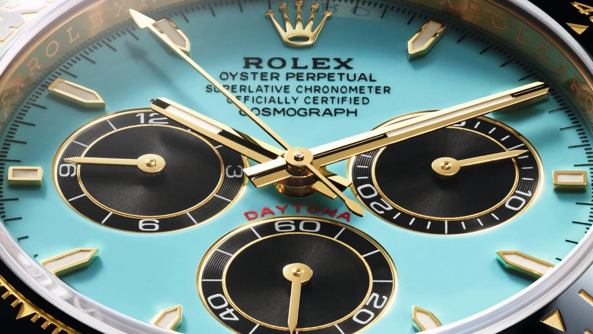 CONTATORI CRONOGRAFICI IN NERO SOLEIL. Come per la cassa, Rolex accentua la tonalità azzurra del quadrante con accenti neri e oro ad alto contrasto. I tre piccoli contatori della cronografia sono realizzati in un nero a contrasto in “stile panda” con finitura soleil e azzurrata. Gli indici svettano per la loro eleganza, le lancette a bastone con eleganti indici in Cromalight (producono una luce azzurra) si armonizzano con gli anelli in oro dei contatori mentre la lunetta interna con scritta Rolex produce una luminosità forte che accresce la percezione lussuosa di questa versione. Il dettaglio finale del suo prestigio iconico è senza dubbio la scritta “Daytona” ad arco a ore 6 sopra il piccolo quadrante dei secondi continui.
